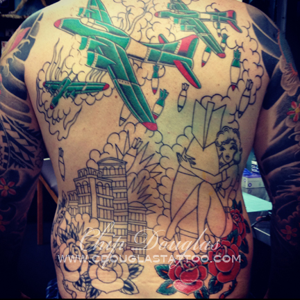 photo of Doug’s back in progress. more lines and shading to come.